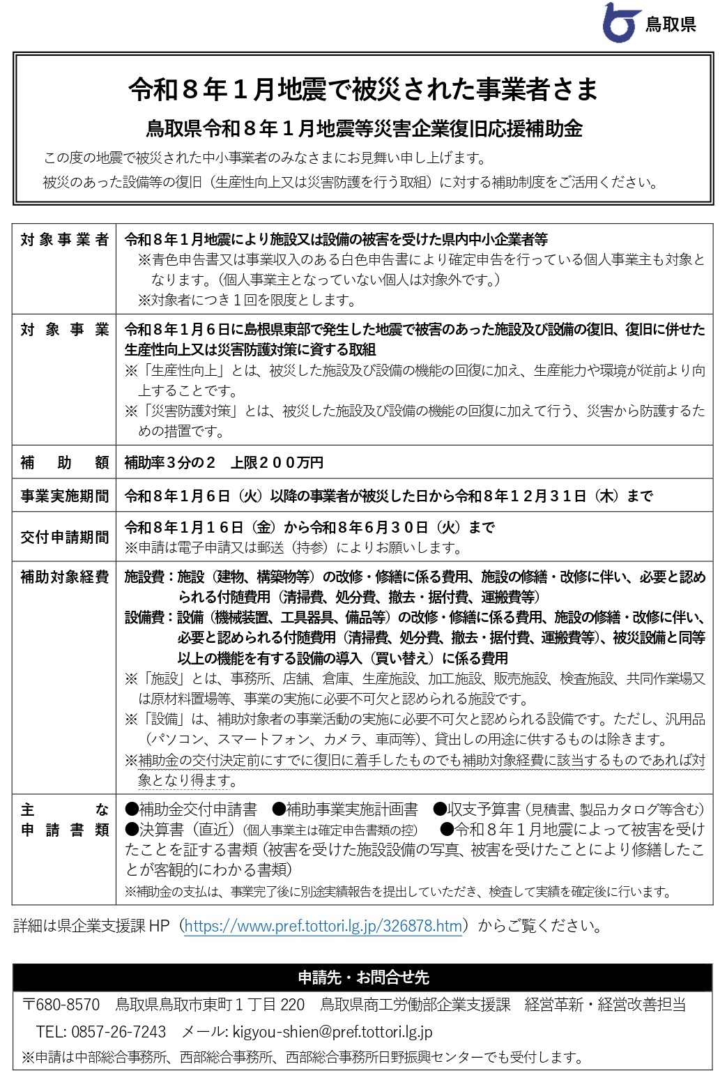 【重要】鳥取県令和8年1月地震等災害企業復旧応援補助金について