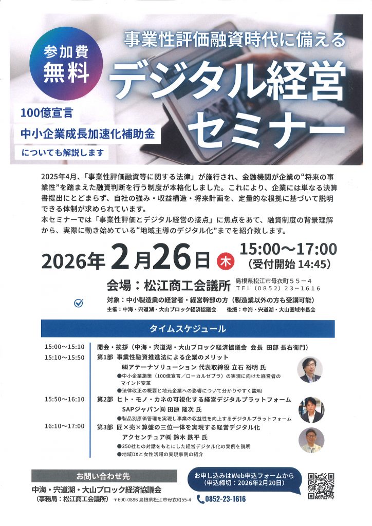 【中海・宍道湖・大山ブロック経済協議会】2/26事業性評価融資時代に備えるデジタル経営セミナー